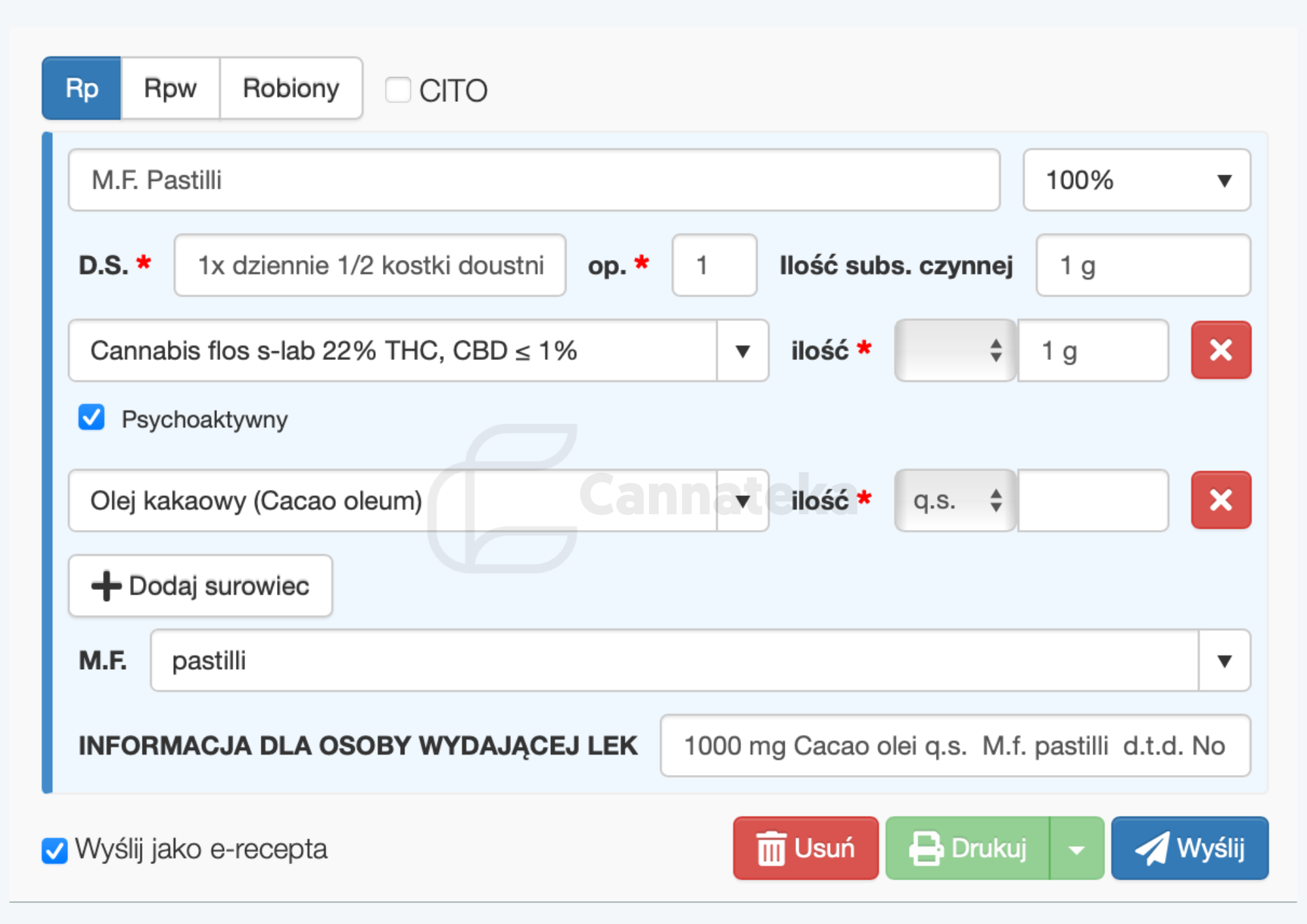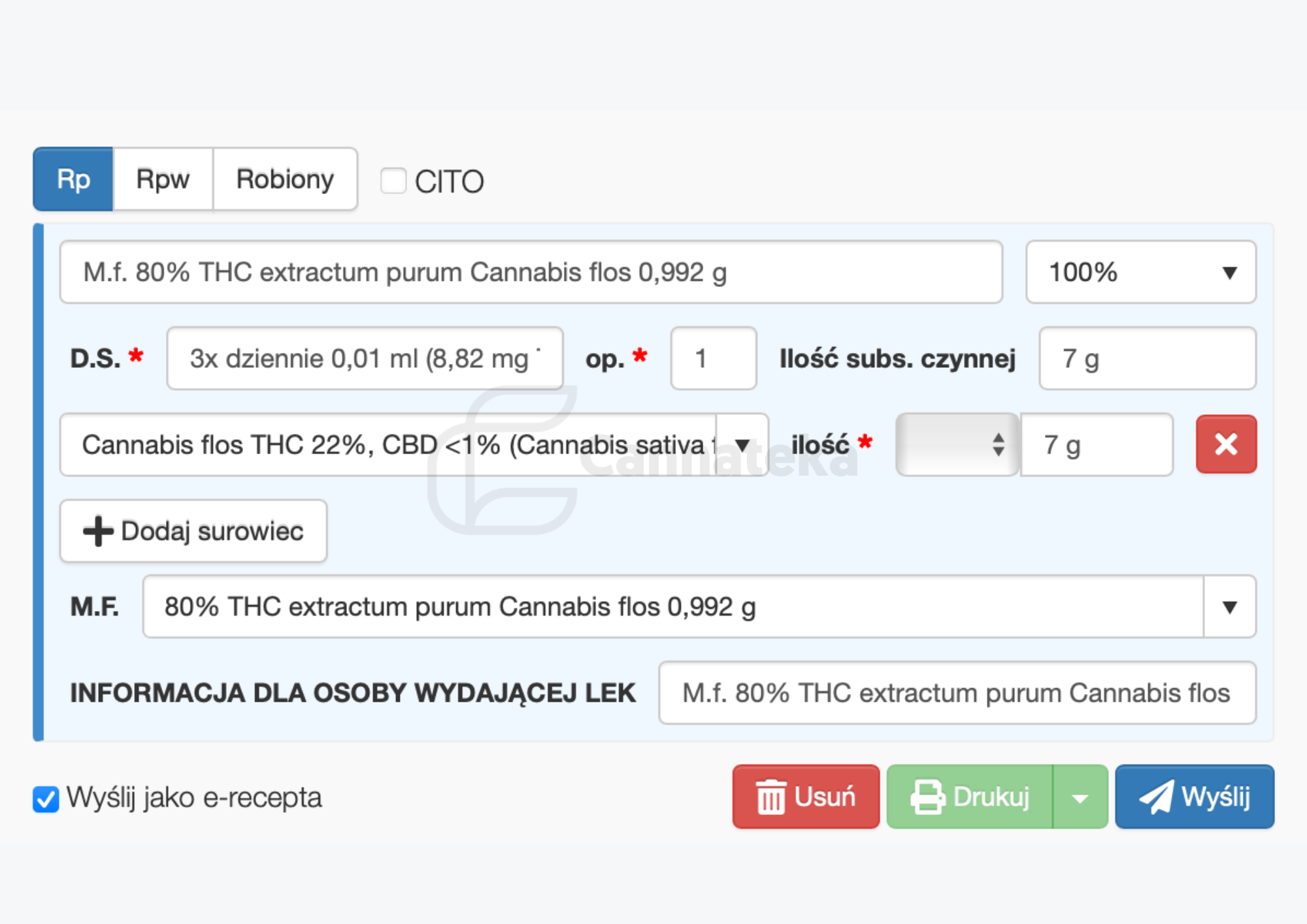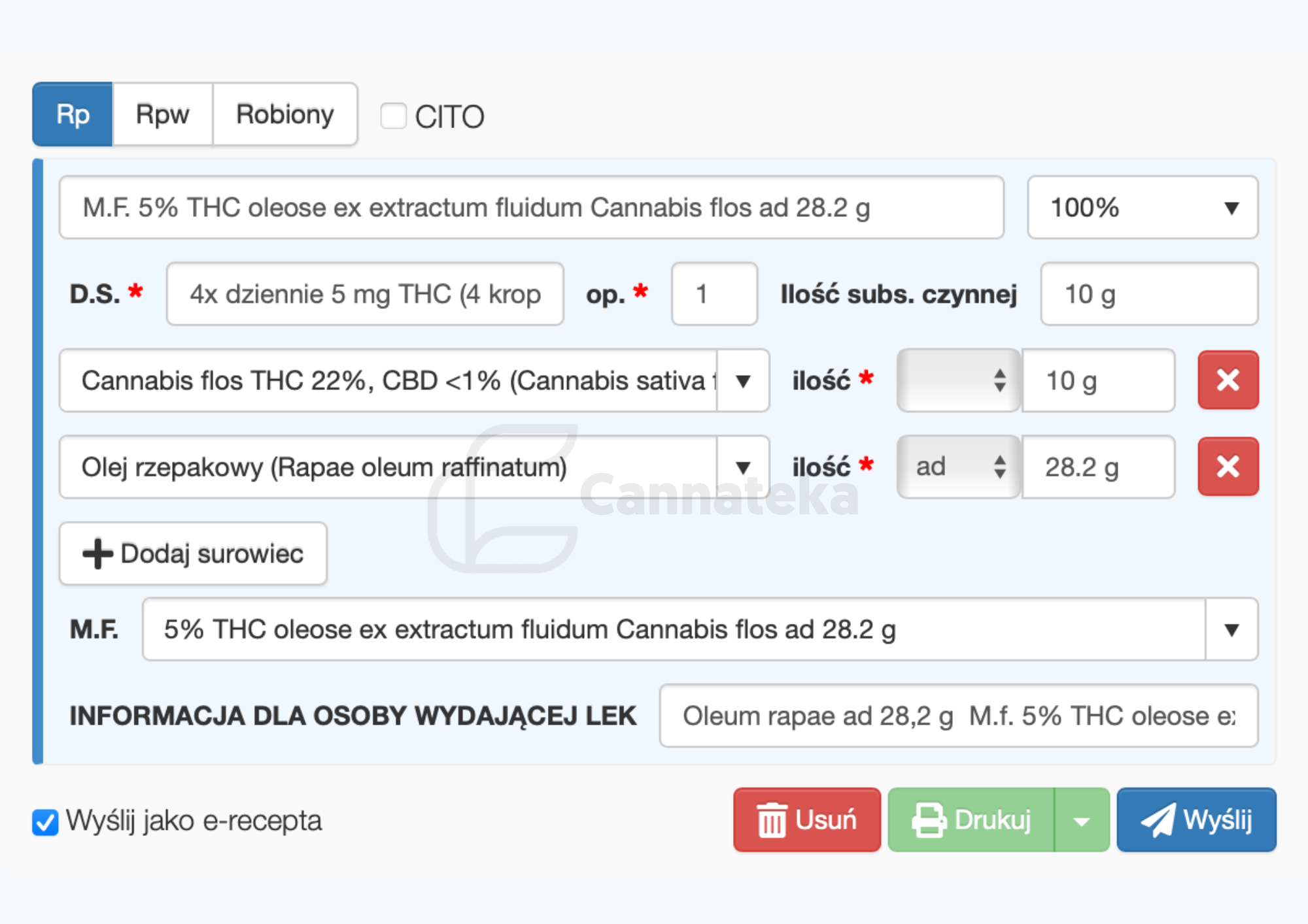 We wzorach recept uwzględniono ilości preparatów odpowiadające miesięcznej terapii. Pacjent może zrealizować receptę częściowo – w ilości nieprzekraczającej wskazanej na recepcie (olej: 30 ml / 3 butelki, ekstrakt: 0,9 ml / 2 cartridge, pastylki: 10 kostek).